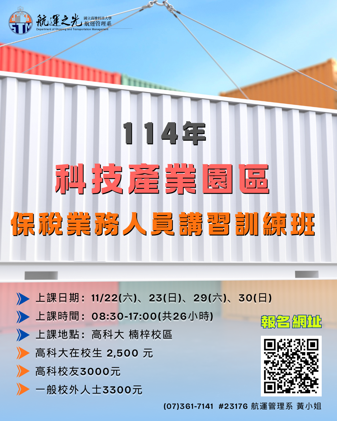 📞 洽詢專線:(07)361-7141 #23176 航運管理系 黃小姐